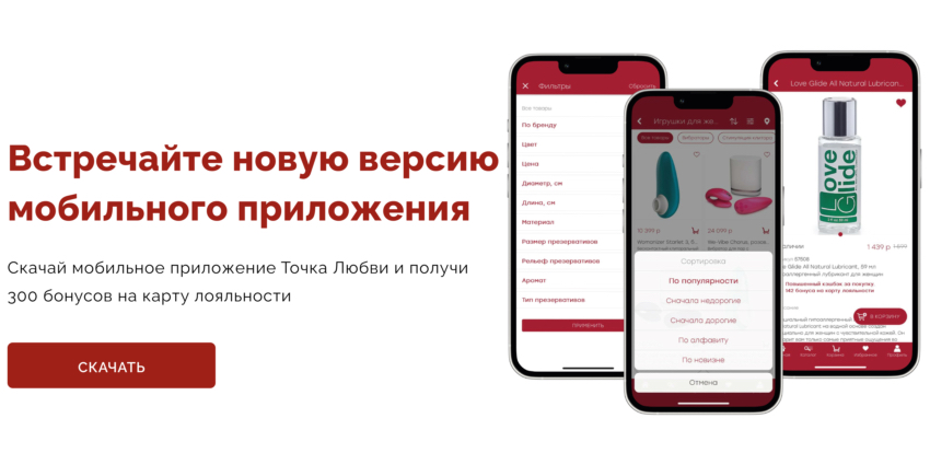 Заказ товаров для взрослых через мобильное приложение в любое время. Возможна доставка по Москве, Санкт-Петербургу, Екатеринбургу, Сочи и Пензе в течение 2х часов, а также самовывоз из любого магазина сети.