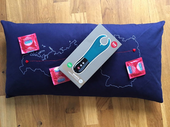 Тут в общем-то все понятно - добротная коробка, которая даже почти не пострадала при перевозке. Разбросанные на подушке презервативы - если что, по задумке отсылка к европейской контрацептивной щепетильности.